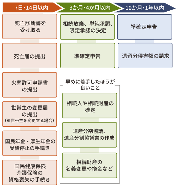 相続のはじまりは突然です。行う必要のある手続きが多く、その多くについて期限が設けられていますが、相続手続きの流れや期限がわからないと優先順位を考えるのも難しいでしょう。